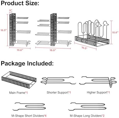 Great Solution For Keeping Your Pots/ Pans/ Lids Organized and Easy to Reach.Our pan organizer rack will help keep your pots, pans, lids, trays, plates, cookie sheets and cutting boards well organized and easy to reach.The compact design allows you to save a lot of space in your cabinets, pantries, and on your countertops.Greatly Helps to Organize Your Cookware!